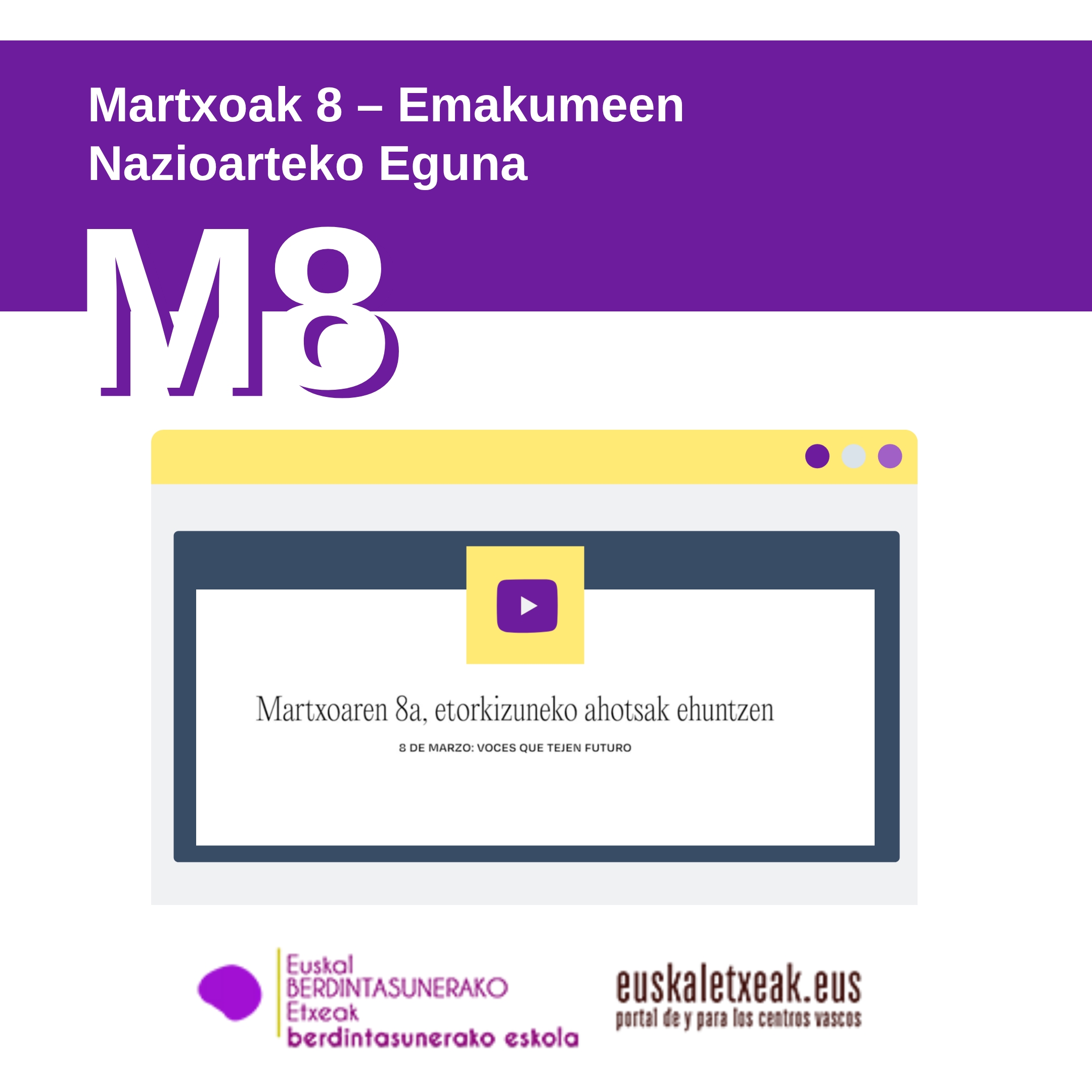 8 de marzo de 2026Estreno del vídeo ‘8 de marzo: voces que tejen futuro’, una pieza coral que recoge testimonios de distintas Euskal Etxeak.Fuente: Irekia – VER EL VIDEO>>